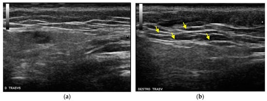 The US qualitative scan evaluation before treatment (a) and three months after the first treatment (b), with an increased thickness in the subcutaneous layer. The yellow arrows indicate the fat hyperechoic areas.