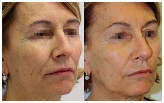 The clinical subject evaluation and photographs taken before treatment (left side), and three months after the beginning of the treatment (right side). A persistent improvement is clearly visible in the mid- (zygomatic and peri-orbital area) and lower-third (jawline and marionette lines) of the face.
