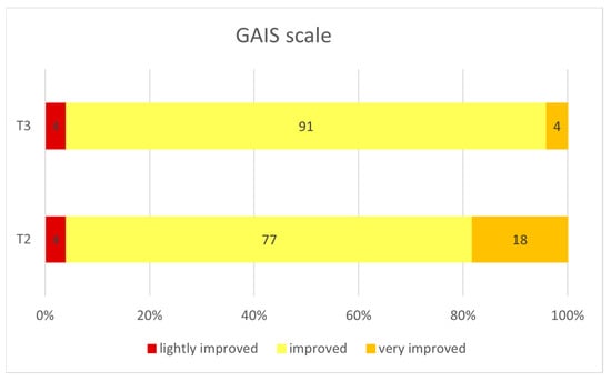 The instrumental evaluations were also confirmed by the patients’ self-assessment, evaluated according to the Global Aesthetic Improvement Scale (GAIS) scale (5-point scale). As shown in Figure 4, the patients showed a significant reduction in wrinkles, and a clear improvement in the general skin quality that were visible especially three months after the first treatment (T3). The amelioration was also confirmed through the GAIS evaluation (Figure 5). In this regard, 77% of subjects had already felt an improvement after the first treatment, and this positive judgement was maintained one month after the treatment (91% of subjects).