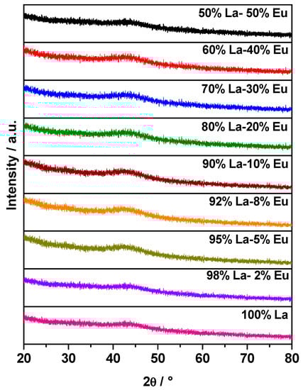 Diffraction peaks of the La2O3 aerogels at different concentrations of Eu3+.