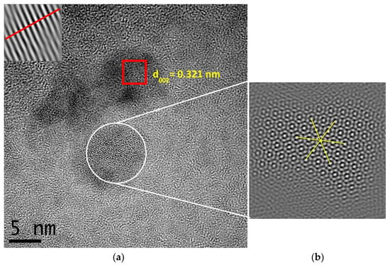 Figure 2a shows the HRTEM image for the 50% Eu3+ aerogel, whose lattice fringes show the crystallographic plane [002] with interplanar spacing of 0.321 nm, according to the ICDD 01-083-13-54 file of La2O3 with a hexagonal structure. It can be seen that the aerogels exhibit semi-crystalline behavior. A material can become crystalline if the temperature and pressure conditions are adequate, so the semi-crystalline nature of the aerogels is likely due to the pressure used in the supercritical drying. Figure 2b, an image edited with DigitalMicrograph software, shows an ordered region made up of multiple hexagons that repeat and form larger hexagons, something never seen before in an aerogel.