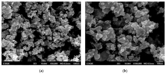 (a) SEM micrograph of the La2O3 aerogel with 50% Eu3+ at ×50,000 magnification; (b) SEM micrograph of the La2O3 aerogel with 50% Eu3+ at ×100,000 magnification.