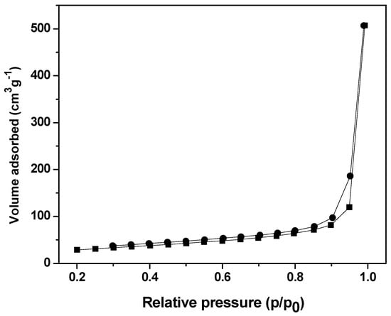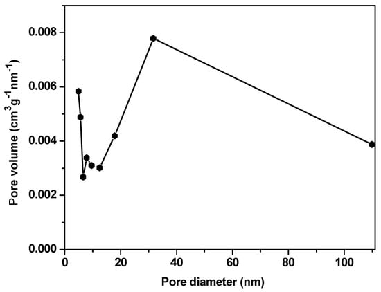 The nitrogen adsorption/desorption technique was used to measure the pore volume, the average pore diameter, and the surface area of the La2O3:Eu3+ aerogel. According to Brunauer et al., it is a type IV isotherm with a H4 hysteresis loop [14,39]. The results are shown in Figure 4. Its surface area is 109.235 m2·g−1, as the average pore diameter and pore volume are 31 nm and 0.750 mL·g−1, respectively (Figure 5).