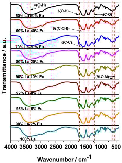 Figure 6 shows the FT-IR spectra of the La2O3:Eu3+ aerogels at different concentrations of Eu. The spectra exhibit a broad band centered at 3400 cm−1, which is associated with the O–H stretching vibrations of water molecules. The absorption bands centered at 1635 cm−1, 1430 cm−1, and 1260 cm−1 can be attributed, respectively, to δ(O–H) deformation vibrations; δs(C–H) oscillations, due to the deformation of the ethanol molecule; and δ(C-C), a bond associated with the propylene oxide used for the synthesis. Other absorption bands, centered at 1098 cm−1, 610 cm−1, and 560 cm−1, are associated with the stretching of υ(C–O) and with M-O m vibrations [3,40,41].