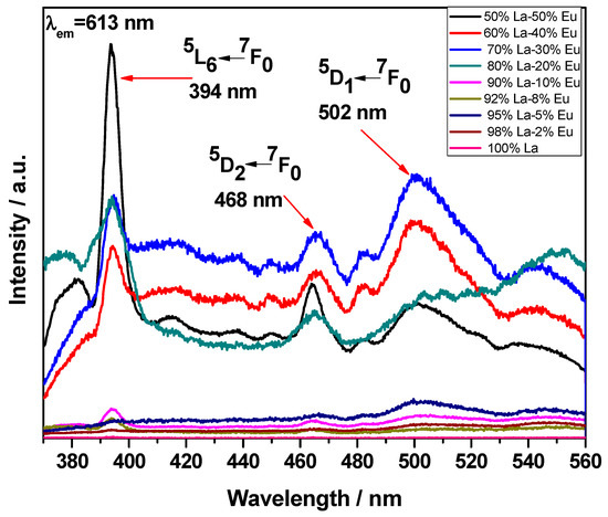 Figure 7 shows the excitation spectra of the La2O3 aerogels at different concentrations of Eu3+. The excitation spectra were measured in the range from 200 to 560 nm with λem = 613 nm. Maximum absorption can be seen at 394 nm, corresponding to the 5L6 ← 7F0 transition. Other absorption bands are located at 468 nm and 502 nm, corresponding to the 5D2 ← 7F0 and 5D1 ← 7F0 transitions, respectively. Note that the intensity of the charge transfer band (CTB) is lower than the maximum absorption peak located at 394 nm. This lower intensity of the CTB with respect to the transition 5L6 ← 7F0 was due to the lack of oxygen linked to La2O3 and to the weak interaction between the Eu3+ and O2- orbitals [42]. Even at high concentrations of Eu, no displacement of CTB was observed, which suggests that the crystalline environment around the Eu ions in the La2O3:Eu3+ aerogels was not substantially affected [42], since the CTB is normally displaced toward longer wavelengths due to changes in the crystalline field around the Eu dopant [43]. The electric dipole 5L6 ← 7F0 transition is the strongest transition in the excitation spectrum of the Eu3+ compounds, except when a 7F6 ← 7F0 transition in the near infrared region is observed [44]. This transition is commonly used to excite Eu3+ and induce photoluminescence if excitation through ligands is not possible due to a lack of efficient energy transfer. The excitation at the 5L6 level allows the 4f levels to be populated directly. It is worth noting that the transition 5D0 → 7F4 in yttria aerogels is particularly strong and not split [41]. The 5D1 ← 7F0 transition is a magnetic dipole transition, while the 5D2 ← 7F0 transition is a hypersensitive electric dipole transition (∆J = 2) [43].