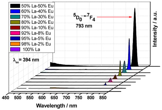 The down-conversion (DC) luminescence spectra of La2O3 aerogels at different concentrations of Eu3+ are shown in Figure 8. The emission spectra were measured in the range from 450 to 900 nm, with λex = 394 nm. An infrared emission band can be observed at 793 nm, corresponding to the 5D0 ← 7F4 transition. This transition is sometimes considered hypersensitive because it does not obey the selection rules for quadrupole transitions (∆J ≠ 2); the intensity of this transition is determined by symmetry factors and by the chemical composition of the host matrix [44]. The luminescence spectra of compounds with D4d symmetry are often dominated by the 5D0 → 7F4 transition since, with this symmetry, the 5D0 → 7F2 transition is forbidden, and the 5D0 → 7F4 transition is intense, because there is no center of symmetry [39,44]. Since the La2O3:Eu3+ aerogels have a strong emission only at 793 nm, we can assume that the Eu ions might be situated at a symmetrical site.