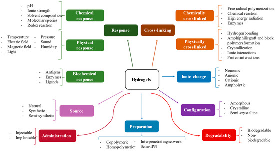 Hydrogels can be classified according to different criteria, i.e., source, cross-linking mechanism, ionic charge, preparation, or stimuli response (see Figure 1) [14,15]. The classification of AMHs according to the source of origin is determined by the materials used to create the hydrogels: Natural hydrogels derive from naturally occurring materials such as proteins, polysaccharides, and their combinations; synthetic hydrogels are created by chemical synthesis using various monomers and crosslinking agents; and hybrid hydrogels are a combination of both in order to improve existing formulations. The classification of hydrogels will be discussed in depth in Section 2.