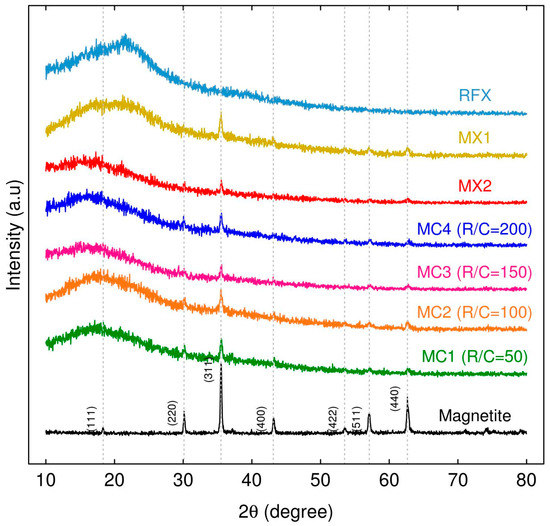 The XRD patterns of magnetic xerogels prepared using direct and indirect sonication methods and different R/C ratios (Figure 1) were found to be similar, with diffraction peaks at 2 θ values of 18°, 30°, 35.5°, 43°, 57°, and 62° corresponding to the crystallographic planes of magnetite 111, 220, 311, 400, 511, and 440, as reported in the ICCD card number 00-01900629. These findings align with the research of [41]. The percentage of crystalline phase for RFX, MX1, and MX2 was 10.54%, 12.45%, and 10.51%, respectively. Meanwhile, the percentage of crystalline phase for MC1-MC4 ranged from 10.51% to 12.64%. The percentage of crystalline phase for magnetic xerogels prepared using direct and indirect methods (MX1 and MC1) at the same molar ratios and gelation process was approximately 12%.