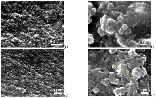 In this study, the SEM analysis revealed the effect of direct and indirect ultrasonication on the preparation of magnetic xerogels. Figure 3 depicts the morphology of magnetic gels, namely MX1 and MC4, synthesized with the same molar ratios. It can be observed that the morphology of MC4 (Figure 3b,d) characterizes nearly spherical particles that partially overlap, resulting in the formation of large pores. This morphology is likely attributed to the incorporation of magnetite particles into the RF gel during synthesis. Comparing MX1 and MC4 at the same magnification range of 15,000 and 25,000, it is evident that MX1 has smaller particle and pore sizes compared to MC4. Additionally, MX1 shows a more compact RF gel structure than MC4. Both techniques involve delivering energy to the RF solution with magnetite particles through probe sonication. However, the resulting particle sizes and mesoporosity of RF gels differ between the two methods. Indirect sonication generates cavitation in the water bath using high-intensity ultrasound through a water bath, while direct sonication involves the probe causing cavitation during sample processing. It can be explained that the particle size of MX1 decreases after ultrasonication, as observed by [37,47,48].