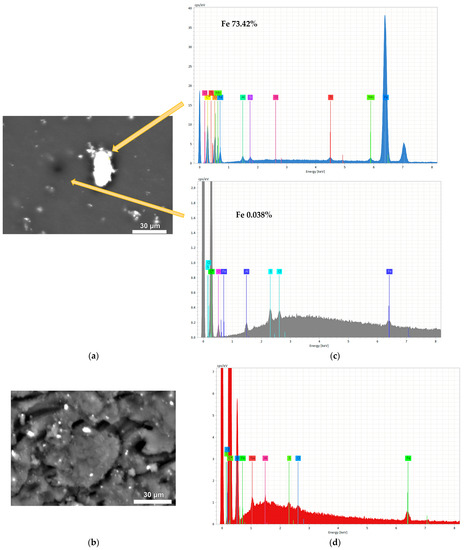 SEM and EDAX images of (a,b) Fe3O4-Monolithic resorcinol-formaldehyde xerogels (MXRF), and (c,d) Fe3O4-Monolithic resorcinol-formaldehyde carbon xerogels (MXRF600).