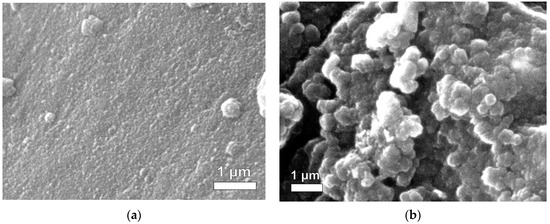 The morphology of RF xerogels (RFX) was observed using scanning electron microscopy (SEM). Figure 2a shows that RFX is composed of a large number of microclusters that are uniformly distributed. These microclusters contain the resorcinol-formaldehyde polymer. The RF gel network is formed with nearly spherical particles, showing similar results to those obtained by [44]. Furthermore, the interconnects between the microclusters were observed to form porous materials. This porosity is likely due to the gelation process used in the synthesis of RFX, which involves the formation of a three-dimensional network of interconnected polymer chains [39,45,46]. Therefore, RFX is a highly porous material with a complex microstructure.