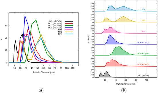 Figure 6 shows the particle distribution of xerogel and magnetic xerogels prepared using the sol-gel method under ultrasonic irradiation. The particle size distribution in the obtained xerogels may vary because of sonication-assisted synthesis and variations in the R/C ratios. RFX exhibits a broader particle size distribution with larger particles compared to MX1 and MC4, which were prepared with the same molar ratios and drying process. RFX, prepared without sonication, showed a larger particle size, which is consistent with the findings of [57].