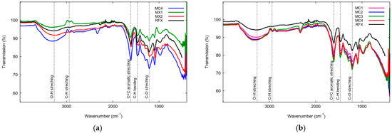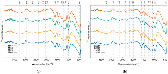 The FTIR spectra of monolithic resorcinol-formaldehyde xerogels prepared by direct sonication, with varying M/R molar ratios of 0.05, 0.1, 0.15, and 0.2 (referred to as MX4, MX5, MX6, and MX7, respectively) are similar, as shown in Figure 11a. Similarly, Figure 11b presents FTIR spectra of MX8-MX11, prepared by indirect sonication, which exhibit similarities. The resulting FTIR spectrum displays peaks corresponding to different vibrational modes of the molecules in the sample, as discussed in detail in Figure 7. Both groups of materials exhibit an FTIR band at 468 cm−1, attributed to Fe-O stretching vibration [60,61]. Therefore, the use of different sonication methods and power outputs of the ultrasonic processor has no effect on the functional groups and chemical compounds present in the samples of monolithic resorcinol-formaldehyde xerogel, based on the absorption of infrared radiation with wavelength ranges of 4000–400 cm−1.