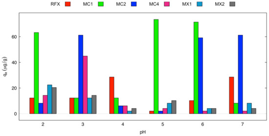 In the batch adsorption experiment of As(V) using MCs and MXs, the effect of pH in the range of 2 to 7 was used to evaluate their adsorption capacities, as shown in Figure 8. MC1 and MC2 demonstrated high adsorption capacities, qe were more in the range of 63.26–73.47 µg/g and 59.18–61.22 µg/g, respectively, than other materials. MX1 and MX2 showed higher adsorption capacity in the acidic solution. Due to the pHpzc being the zero net charge on the surface of the adsorbent, the adsorbent surfaces are charged positively or negatively, depending on whether the pH of the solution is lower or higher than the pHpzc values, respectively [55]. The analysis result of pHpzc of MX1 was 4.54, meaning that MX1 adsorbed As(V) at pH values lower than this value. The same can be described for the adsorption of MC1 and MC2, whose pHpzc values were 6.63 and 6.12, respectively.