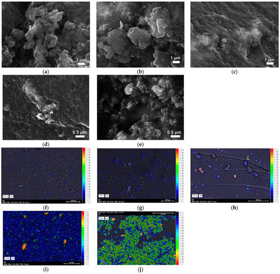 SEM images and EDX mapping analysis of magnetic xerogels prepared with R/C = 200, R/W = 0.04, and varying M/R of MX3 = 0.03 (a,f), MX4 = 0.05 (b,g), MX5 = 0.1 (c,h), MX6 = 0.15 (d,i), and MX7 = 0.2 (e,j), respectively.