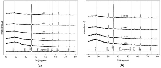XRD patterns of magnetic xerogels prepared by (a) direct (MX3-MX7) and (b) indirect (MX8-MX11) ultrasonic with varying M/R ratios of 0.03–0.2.