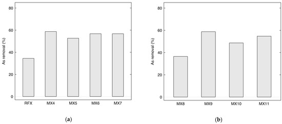 Figure 12b shows the arsenic removal using MX8-MX11 prepared by indirect ultrasonic-assisted synthesis with 700 watts. The removal of MX8 (M/R = 0.03) and MX9 (M/R = 0.05) increased dramatically from 36.49% to 58.78%. With the increasing of M/R to 0.1 and 0.15, their arsenic removal of MX10 and MX11 remained constant, which demonstrated the same behavior as MX4-MX7.