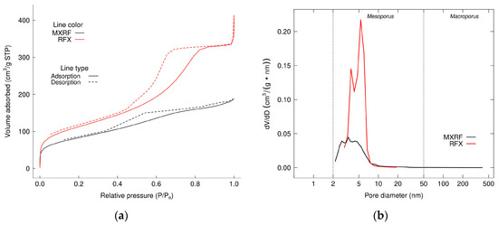 Figure 14a shows N2 adsorption–desorption isotherms at 77 K, and Figure 4b illustrates the pore size distributions of XRF and MXRF. The analysis results of BET surface area, total pore volume, and average pore size of xerogel adsorbent were 399.19 m2/g, 0.517 cm3/g, and 5.228 nm, respectively. When magnetite composites were added to xerogels, the porous properties of MXRF for BET surface area, total pore volume, and average pore diameter were 292 m2/g, 0.279 cm3/g, and 3.81 nm, respectively.