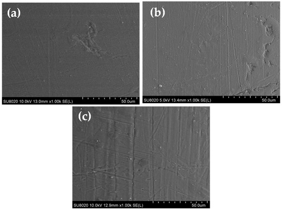 SEM images on the top-surface of coated copper wires with pure extruded resin: (a) EIS Sol–gel 1, (b) EIS with Sol–gel 2 and (c) EIS with Sol–gel 3.