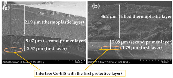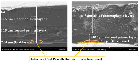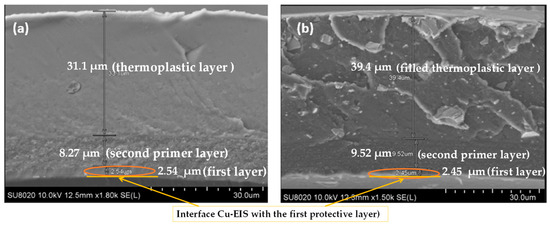SEM images obtained on the cross-section of coated copper wires EIS Sol–gel 3 (a) with pure polymer extruded topcoat and (b) with filled extruded polymer.