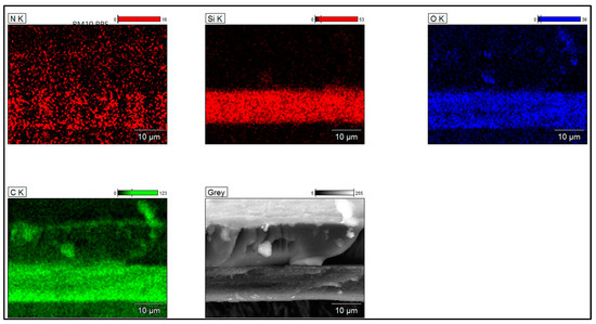 To determine the silica dispersion, grain size, and morphology in the primer layers, SEM images coupled with EDX analyses were collected from the samples on the cross-section zones. The EIS systems obtained from the three types of Sol–gel processes are shown in Figure 6, Figure 7 and Figure 8. The silica distribution into PAI polymer chains (represented by Si and O elements and evidenced by FTIR analysis) seems homogeneous and well dispersed into the primer layer (hybrid silica–PAI layers) for each enameling pass with particle size in the nanometric scale (about 250 nm for all EIS systems with Sol–gel 1, 2 and 3). At some zone (primer layer), the O, N, and C elements represent PAI polymer chains.