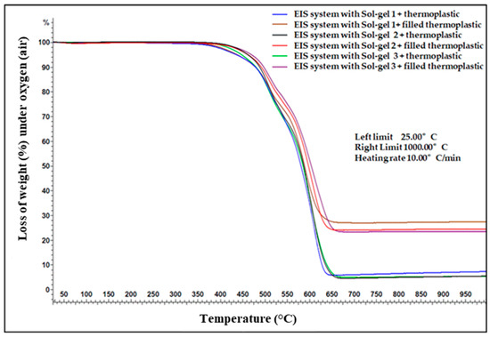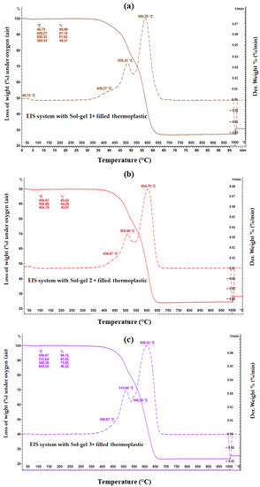 TGA measurement on the EIS systems with filled thermoplastic topcoat, and each type of Sol–gel from (a–c).