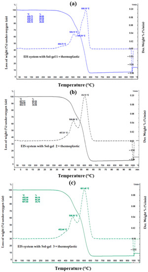 TGA measurement on the EIS systems with thermoplastic topcoat, and each type of Sol–gel from (a–c).