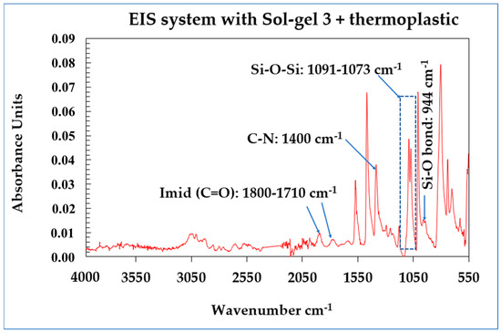 The FTIR analysis was measured in the range of 4000–550 cm−1 on the enamel wires (coated copper wires with the different EIS systems). The behavior of the unfilled thermoplastic EIS systems (or filled thermoplastic EIS systems) was similar and evidenced the formation of a network of Si-O-Si in the PAI matrices. By correlating the SEM-EDX with FTIR analyses, the conversion of Si-OH (hydrolyzed groups obtained from the starting sols named Sol–gel 1, Sol–gel 2 and Sol–gel 3) to silica (polycondensation state gel Si-O-Si) was evidenced. The Sol–gel process gives a homogeneous dispersion of silica into the PAI matrices. From the FTIR analysis shown in Figure 12, the absence of a broad band between 3000 and 3500 cm−1 indicates the absence of OH groups and the full polycondensation of Si-OH to the Si-O-Si network. The character of the asymmetric stretching mode vibration of the Si-O-Si group was observed as a doublet at intense peaks in the range of 1091–1073 cm−1, confirming the formation of network Si-O-Si [12,13,14]. From the PAI signature, the amide C=O region is observed around 1710 cm−1 and, at 1774 cm−1, the absorbance is associated with the imide carbonyl band, and the absorption band for symmetric stretching of C-N was observed at 1385–1363 cm−1.