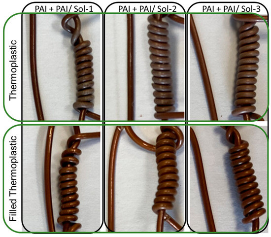 - The wires composed of the solution Sol–gel 1 (30%)/PAI (70%) showed the presence of cracks when they were wound around their diameter. This solution presents a particularity compared to the others due to the type of Sol–gel and its concentration since, for Sol–gel 1, 30% of the solution is miscible in PAI. The miscibility of this type of Sol–gel is limited to 50%. This is not the case for Sol–gel solutions 2 and 3. However, this higher concentration is possibly a factor that affects the flexibility properties, as already observed in studies at different concentrations [5,8,9].