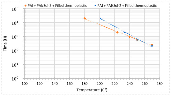 - The thermal index is estimated for the wires which held enough cycles during thermal aging at the three temperatures. The thermal index estimation is determined by the IEC 60216-3 standard [24]. The steps of the analysis of the experimentation data are the following. The experimental data were transformed into x and y values, based on Equations (1) and (2).