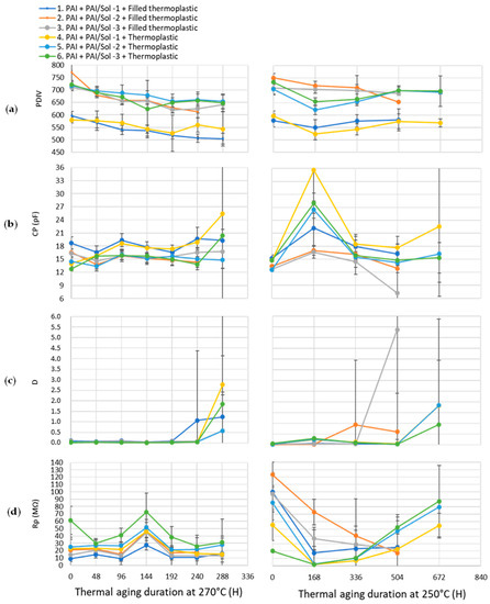 - Pereira dos Santos Lima, G.; Ait-Amar, S.; Velu, G.; Frezel, P.; Boudiba, A.; Poelman, M.; Nicolay, A.; Herze, P.-Y. Performance Analysis Based on Thermal Aging Tests of Sol-Gel and Polymer Insulated Wires by Enameling and Extrusion Technology. Energies 2022, 15, 5164. [Google Scholar] [CrossRef]