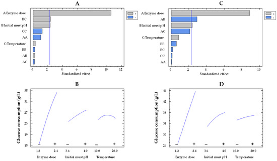 Pareto chart of the standardized effect (A) and a main effects plot (−: low; +: high) (B) for glucose consumption with the immobilized GOX–CAT system. Pareto chart of the standardized effect (C) and a main effects plot (D) for glucose consumption with the free GOX–CAT system. Enzyme dose of must is in U/mL; temperature is in °C.