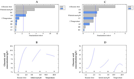 Pareto chart of the standardized effect (A) and a main effects plot (−: low; +: high) (B) for gluconic acid concentration with the immobilized GOX–CAT system. Pareto chart of the standardized effect (C) and a main effects plot (D) for gluconic acid concentration with the free GOX–CAT system. Enzyme dose of must is in U/mL; temperature is in °C.