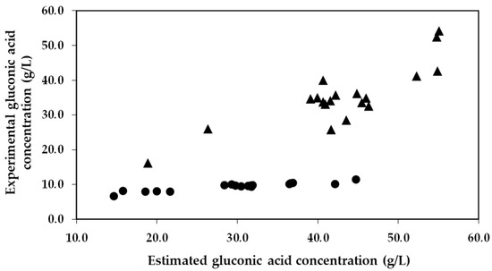 Estimated gluconic acid concentration obtained from glucose oxidation versus the experimental gluconic acid concentration obtained in the must for each run of the Box–Behnken design. The circles (●) represent the data of the immobilized GOX–CAT system, and the triangles (▲) represent the data of the free enzymes.