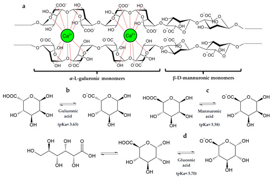 (a) Two-chain fragment of the alginate polymeric structure consisting of α-L-guluronic and β-D-mannuronic acids monomers and their interactions with calcium ion according to the “egg-box model”. Stereo projections and pKa of -L-guluronic (b) and β-D-mannuronic (c) acids present in sodium alginate and gluconic acid (d) [44,45].