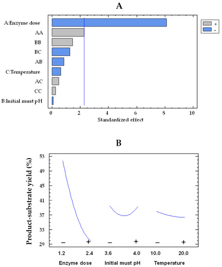 At this point, it is interesting to identify the factors and their levels that minimize the product–substrate yield. For free enzymes, an average product–substrate yield of 99.5% was obtained. However, the selected model for the product–substrate yield (Equation (1)) was inadequate to describe the observed data from free GOX-treated musts, as the p-value for the test of lack of fit was <0.05, indicating that the studied variables had a limited influence on the yield of free enzymes. However, the Pareto plot for co-immobilized enzymes showed that the enzyme dose effect was negative and statistically significant (Figure 5A).