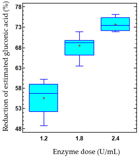 Effect of the co-immobilized enzyme dose on the reduction of estimated gluconic acid (%) in must. The data is represented using box-and-whisker plots, where the lower and upper edges of the box represent the first and third quartiles, respectively. The middle line within the box always represents the second quartile, also known as the median. The vertical lines extending from the boxes, known as whiskers, indicate the highest and lowest values in the dataset. Additionally, plus signs (+) are used to indicate the mean for each group.