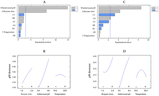 Pareto chart of the standardized effect (A) and a main effects plot (−: low; +: high) (B) for pH decrease with the immobilized GOX–CAT system. Pareto chart of the standardized effect (C) and a main effects plot (D) for pH decrease with the free GOX–CAT system. Enzyme dose of must is in U/mL; temperature is in °C.