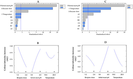 Pareto chart of the standardized effect (A) and a main effects plot (−: low; +: high) (B) for color intensity increase with the immobilized GOX–CAT system. Pareto chart of the standardized effect (C) and a main effects plot (D) for color intensity increase with the free GOX–CAT system. Enzyme dose of must is in U/mL; temperature is in °C.