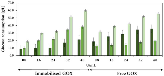 The efficiency of the co-immobilized and free GOX was studied by analyzing the consumption of glucose during both the initial and the subsequent 24 h periods of must treatment at different enzyme doses. Figure 9 shows the glucose consumption during the first and second 24 h periods of enzyme reaction, as well as the total glucose consumption at 48 h at different doses of the co-immobilized enzymes. The experiments were also performed with the free enzymes for control purposes. The total glucose consumption after 48 h of enzyme treatment increased as the enzyme dose increased, reaching 55.5 and 59.6 g/L at 4.0 U/mL of free and co-immobilized enzymes, respectively, resulting in a notable reduction of the potential alcoholic strength of must at 3.2 and 3.5% vol. (v/v), respectively. Regarding the free enzymes, the most significant glucose consumption occurred within the initial 24 h period, followed by a subsequent decline in glucose consumption. In contrast, the behavior of the co-immobilized enzymes was different, as the glucose consumption during the initial 24 h period was lower compared to the consumption observed during the subsequent 24 h period. In the initial 24 h period, the ratio of glucose consumed per enzyme dose was 52.1% higher for the free enzymes (0.98 g/U) compared to the co-immobilized enzymes (0.64 g/U). However, in the subsequent 24 h period, the ratio was 87.1% higher for the co-immobilized enzymes (1.63 g/U) compared to the free ones (0.21 g/U), indicating an increased efficiency of the co-immobilized enzymes along the reaction time [52].