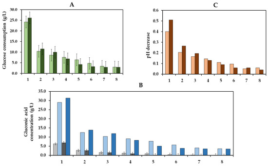 ) gluconic acid concentration (g/L) at an initial must pH of 4.0 are plotted as a function of enzyme treatment cycles of 48 h each (B). The pH decrease produced in the must at initial pH levels of 3.8 (