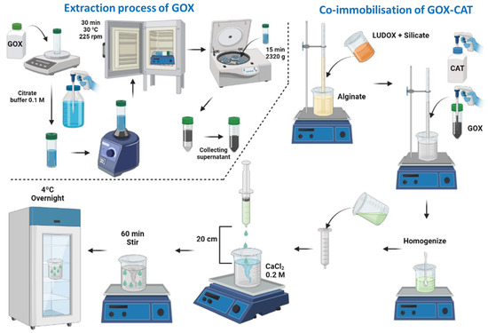 Flow chart of the extraction process of the GOX enzyme from its floury matrix and the general procedure to obtain the silica–calcium–alginate capsules with the immobilized GOX–CAT enzymes.