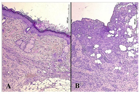 The newly formed epithelium in between the perforation lumens of the split-thickness skin graft demonstrated extensive growth, with signs of the formation of skin derivatives. In the study group, there was a well-defined papillary layer under the epithelium base membrane; this layer was formed of loose connective tissue that protruded into the epithelium as papillae. This contrasted with the tissue samples from the control group, where a thin, even epithelial layer of low quality with pronounced leukocyte infiltration was found (Figure 1).