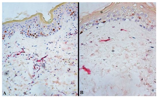 Expression of Ki-67 in the burn wound tissues closed with split-thickness skin grafts from patients of the study (A) and control (B) groups on day 7 after free skin grafting (D14). Brown staining—Ki-67-positive cells; red staining—membranes of endothelial cells; ×200.
