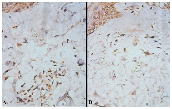 Expression of biomaterial to VEGF in the lumen between the recipient wound and the split-thickness skin graft of the study (A) and control (B) groups on day 7 after free skin grafting (D14). Brown staining—cells expressing receptors to VEGF; ×400.