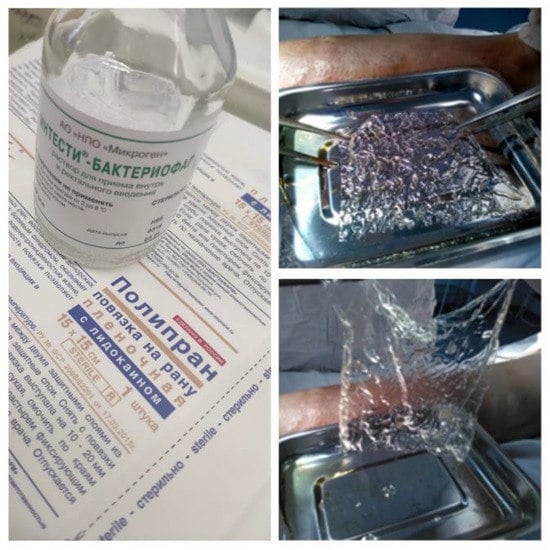 The authors suggested and have patented a technique for the topical application of bacteriophages in hydrogel. First, the microflora colonizing the graft site, and the sensitivity of these isolated pathogens to bacteriophages were identified. Then, a blank film was prepared for use by the addition of polyvinyl alcohol containing a phosphate buffer with a pH of 6.6–7.8 in the amount of (1–3) × 105 mol/g. The blank film is a standard product—Polypran wound dressing (“Novyje perevyazochnyje materialy” (New dressings) LLC, Moscow, Russia). A total of 0.05 mL/cm2 of bacteriophage suspension were added to the prepared blank film, after which the film took on its gel form within 30 s. All Polypran samples were of the same area—225 cm2, and had absorbed the same volume (11.25 mL) of the suspension.