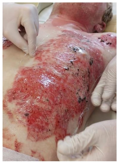 Over 40% of burn wounds in patients undergoing inpatient treatment in burn centers are of full-thickness type [,,] and require plastic closure. Relatively simple and safe, and thus one of the most widespread methods of plastic closure of burn wounds, is free skin grafting with a split-thickness skin graft []. However, subsequent lysis occurring with such split-thickness skin grafts is up to 30% [,], which leads to increases in the duration and cost of treatment due to the need for repeated plastic surgeries [].