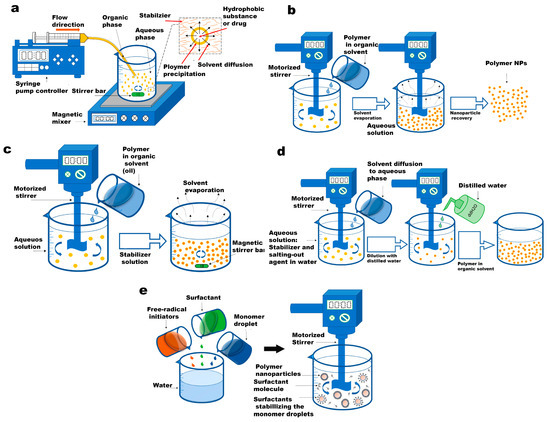 Various techniques, such as emulsification–diffusion, solvent emulsion–evaporation [36], interfacial deposition, and nanoprecipitation [37], have been employed to prepare PLGA nanoparticles. In the emulsification–diffusion technique, PLGA polymers are dispersed in a nonaqueous solvent, isolated in a water-based phase containing an additive, and mixed using a mixer. Subsequently, the obtained polymers are dispersed in a volatile nonaqueous solution, which is then added to a continuously swirling water-based phase containing an emulsifier/stabilizer and subjected to sonication for solvent evaporation. Interfacial deposition techniques have been used to prepare both nanocapsules and nanospheres.