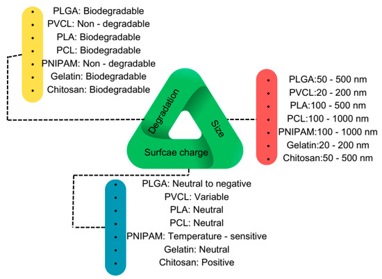 Regarding surface charge, the focus has been on the bare nanoparticle’s charge, though it is feasible to modify the surface charge by coating the nanoparticles with different materials. Initially, the surface charge is controlled by the charged or functional groups of the polymers and can later be altered to become more negative, positive, or even naturally charged, depending on the study’s objectives. In terms of biodegradability, all polymers except PNIPAM and PVCL are biodegradable and can degrade in physiological fluids and temperatures. In the following sections, we will review the chemical structures and properties of these polymers, as well as the various applications they have been employed for.