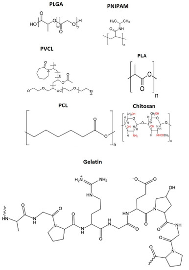 The biodegradable system PLGA has proven to be a reliable tool in the development of nanomedicine, as it undergoes degradation in the biological body to form biodegradable metabolites, namely, lactic acid and glycolic acid. Figure 4 presents the chemical structure of PLGA and other polymers commonly used in biomedical applications. Due to the body’s efficient handling of these two monomers, PLGA exhibits extremely low systemic toxicity when used for drug delivery or tissue engineering purposes.